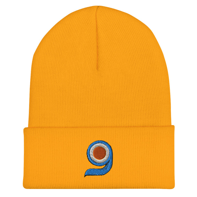 Gray cap featuring a stylized number 9 logo in blue and orange