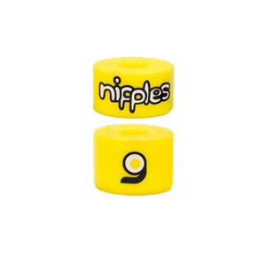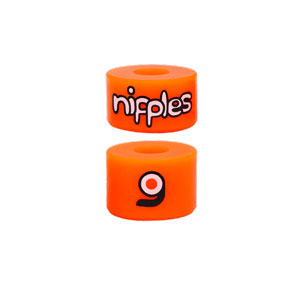 Two orange skateboard wheels with text, one labeled 'nipples' and the other with the number '9'.