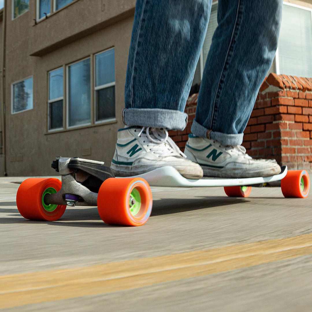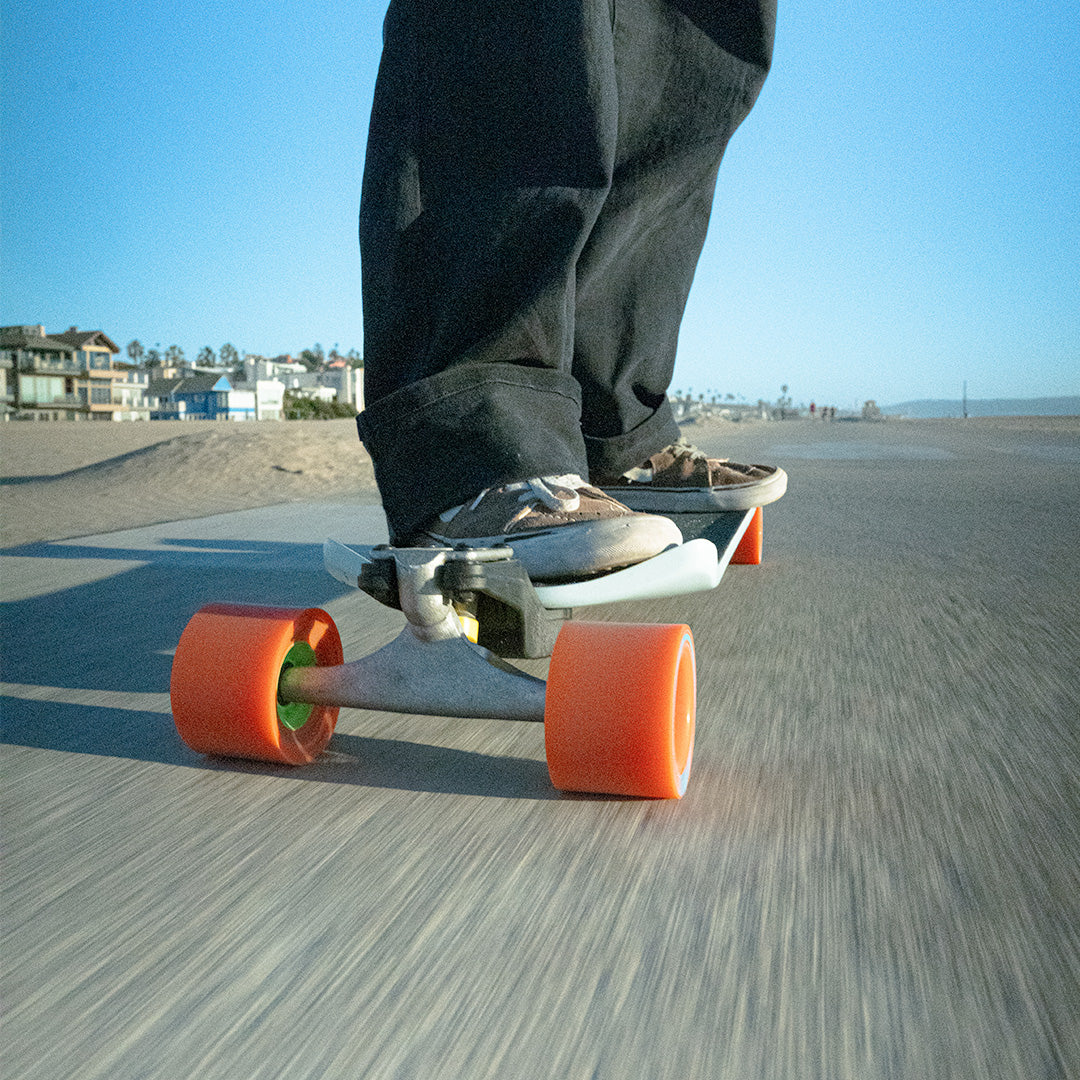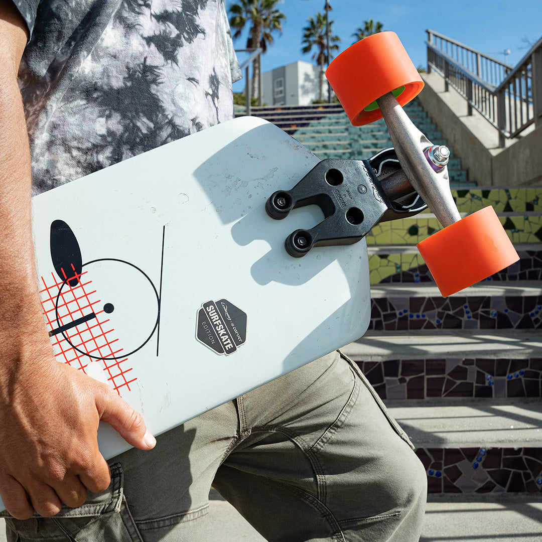 A whole new experience to reimagine surfskating: big wheels and a super-low ride height. Our distance surfskate setup is equipped with a Carver CX truck set and Orangatang Kegels for a refined surfskate experience with responsive, snappy turns and effortless pumping.