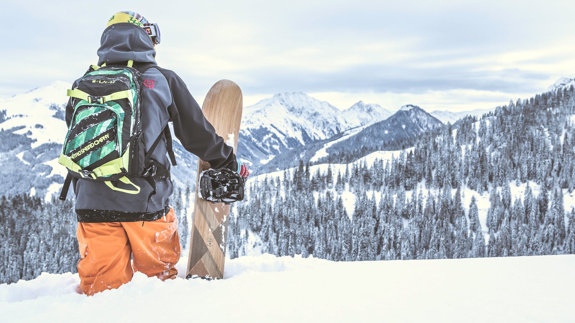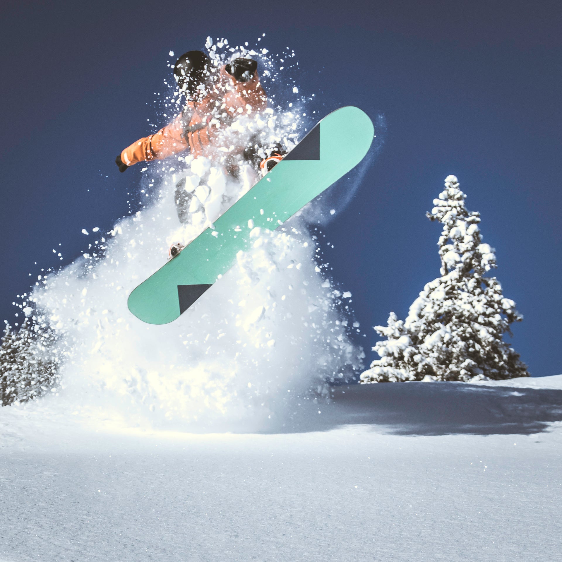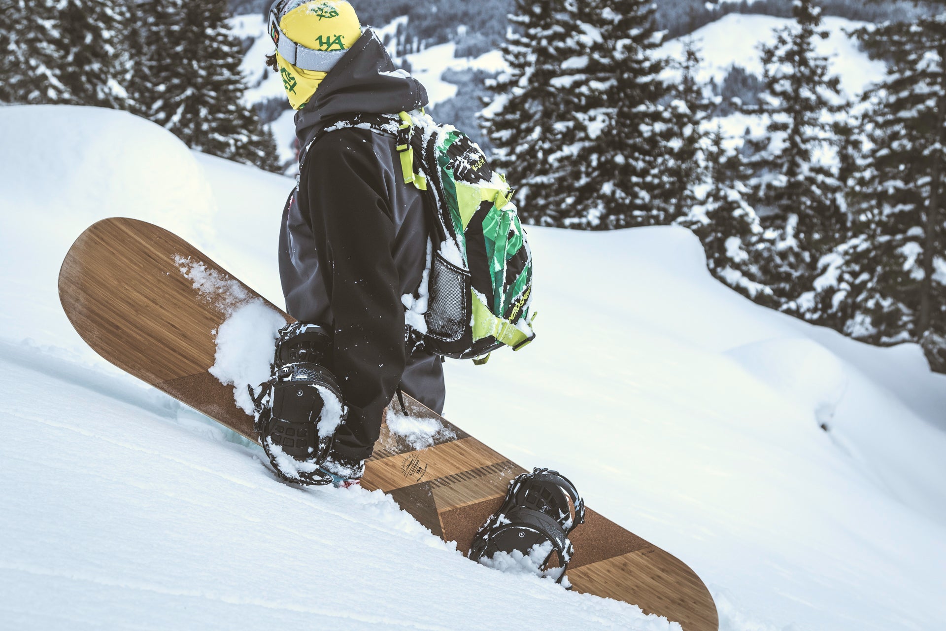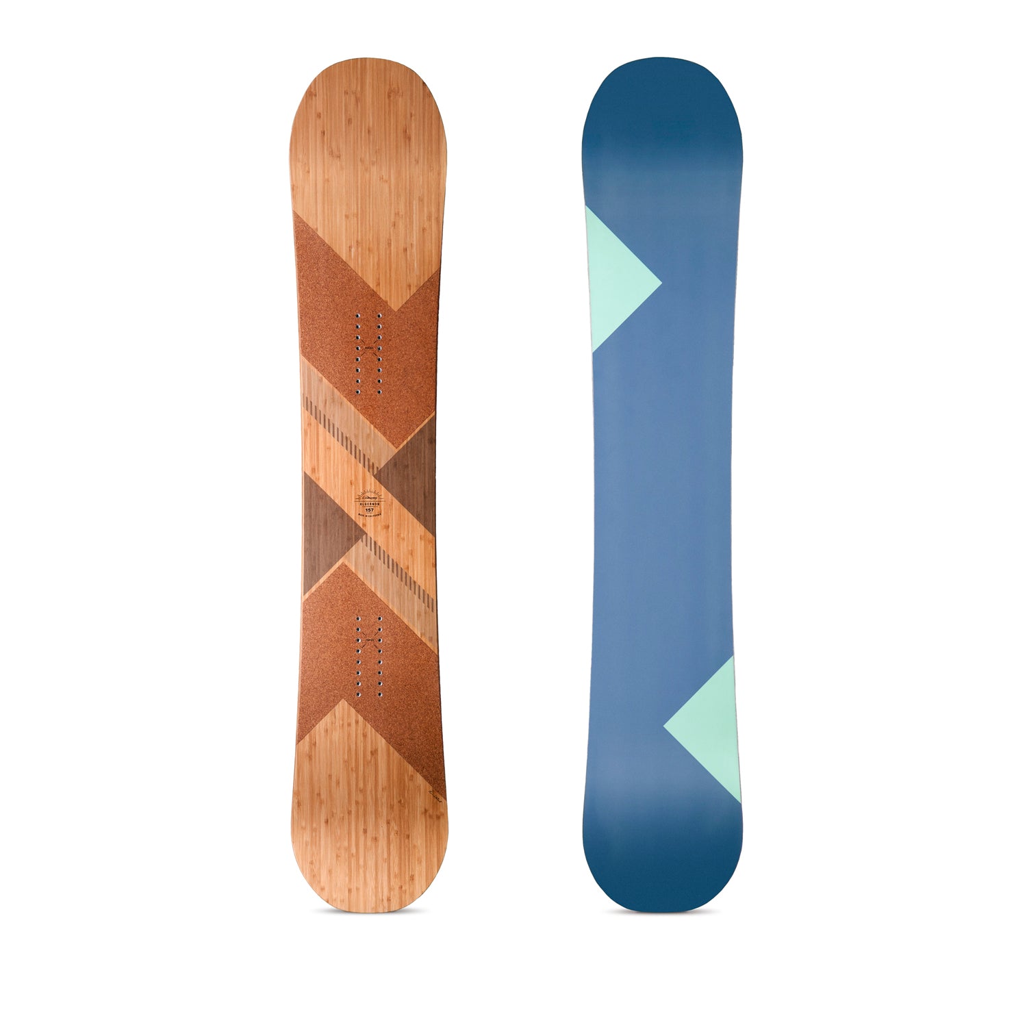 A snowboarding deck showcasing a wooden patterned side and a solid blue side.