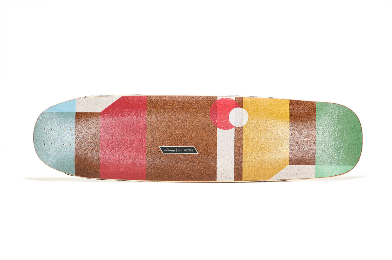 A skateboard deck viewed from the top, bottom, and side, featuring a textured grip surface and a colorful design.