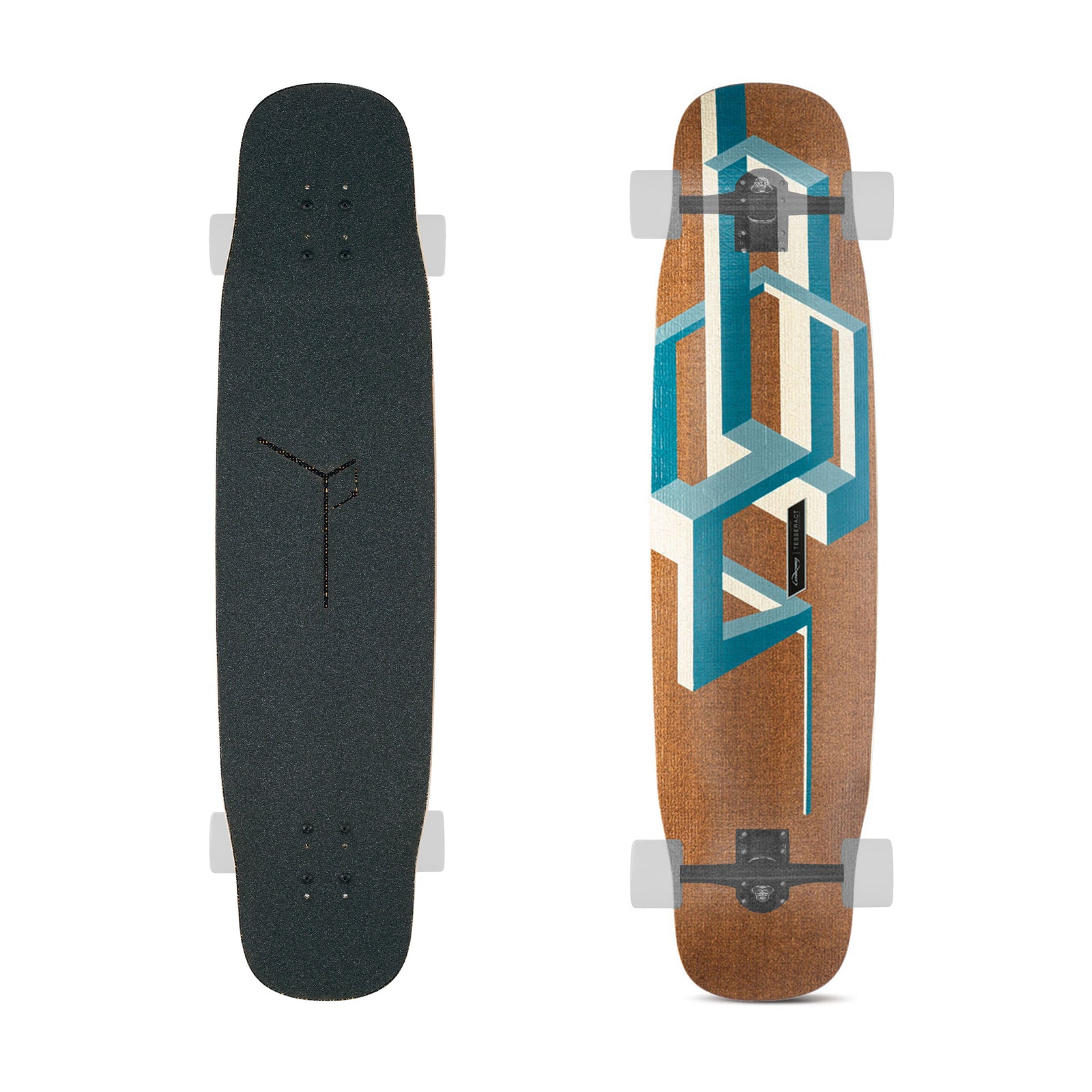 The Basalt Tesseract integrates dual kicktails, rocker, wheel well flares, W concave, and multiple wheelbase options into a lightweight package designed for hilly descents, snappy slides, lofty ollies, techy manual combos, and cross-steps galore.