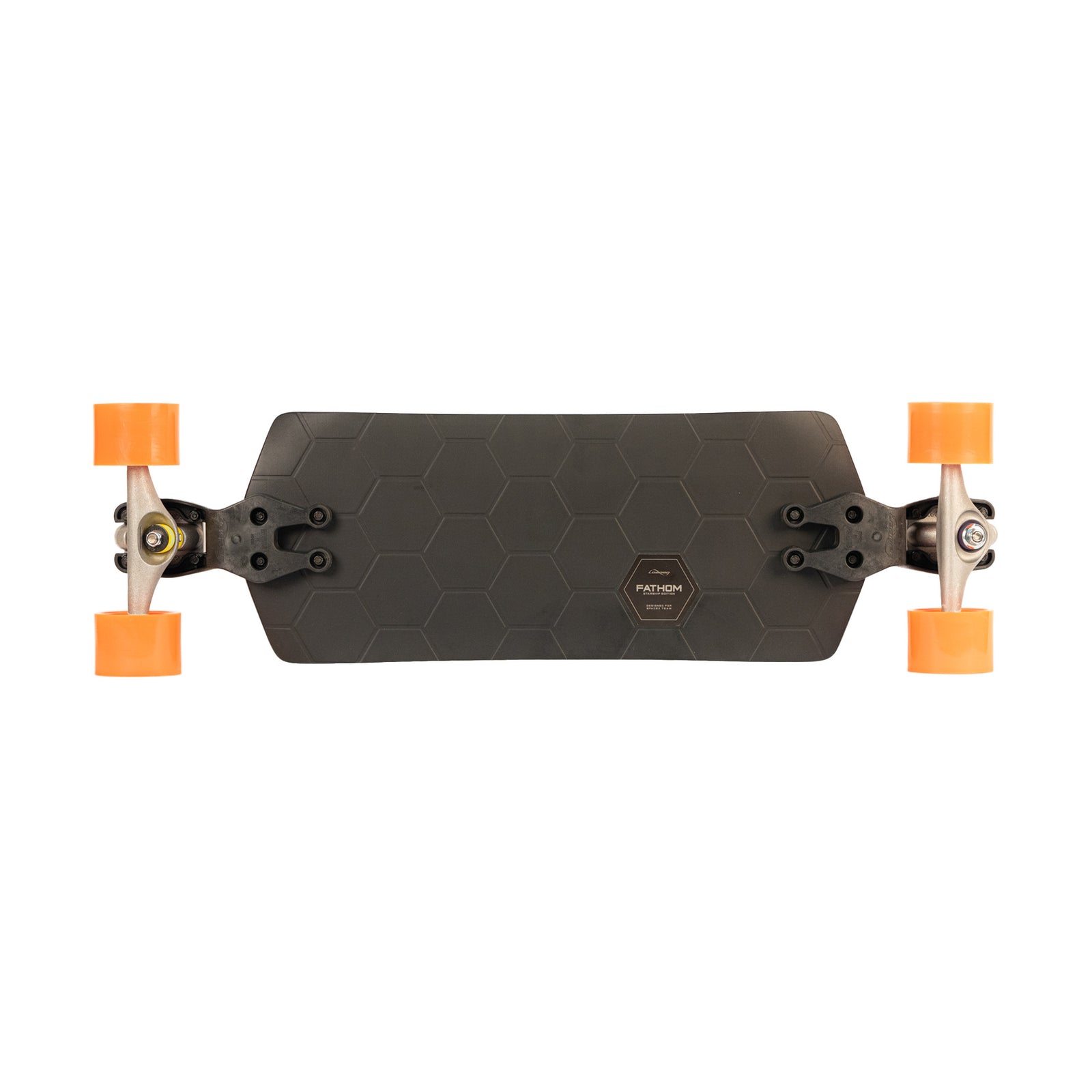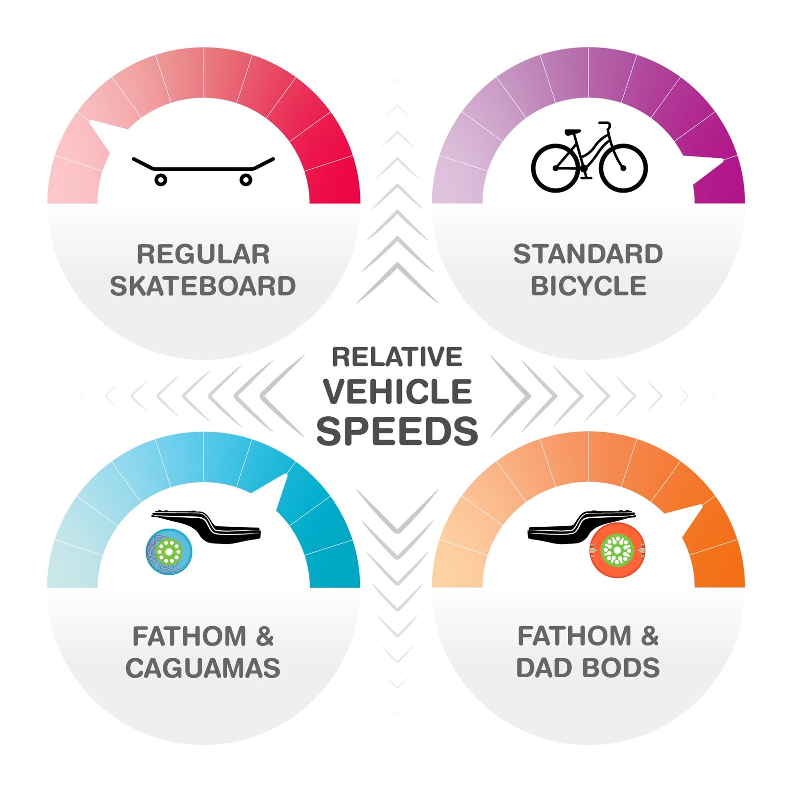 The Fathom is built for speed and momentum. With its large (up to 105mm) wheels and agile trucks, this board bridges the gap between board and bike, easily reaching and sustaining commuting speeds that surpass the comfort zone of conventional skateboards. Get a good workout, explore the roads less traveled, or get to class/work without breaking a sweat. It’s up to you.